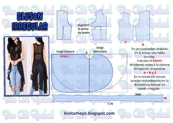 Como siempre usaremos el patron basico a medida del cuerpo para diseñar este modelo. En este caso se va a eliminar, como un bloque, la capacidad del busto que hemos incorporado con el pinzado. Tomaremos la medida del bajo de los patrones que no ocupara pinzas de entalle y lo multiplicaremos por dos , para resolver el Radio del faldon que sera trazado como una falda circular. Al tizar sobre la tela plegada en 4, en uno de los lados se rebajara el largo de manera redondeada, para crear el efecto irregular del bluson. Atencion! Suprimir la pinza de busto equivale a una prenda con tara. Este bluson es suelto y no lleva ningun entalle. Pueden notar en la imagen que el escote trasero y la linea del borde inferior se "cae" al no tener aplomo la prenda, que da justamente la pinza de busto. Del mismo modo en la parte delantera se evidencia como se eleva el borde inferior. Inevitablemente el busto levanta la prenda y hace que caiga hacia el trasero. Este defecto tambien se ve en camisas unisex, sin pinzado. Por ser una prenda desestructutada como tunica este defecto se tolera. Pero no es recomendable para prendas al cuerpo.