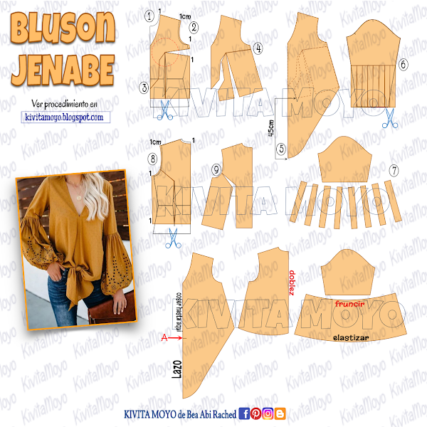 Cortar 2 veces la delantera, dos veces la manga( 2 veces la parte superior, y 2 veces la parte del farol.) y una vez la parte trasera en el doblez de la tela. Cada pieza con su margen de costura. Por otra parte copiar de los escotes las vistas, o bien cortar tiras al bien con la medida del recorrido tal del escote.