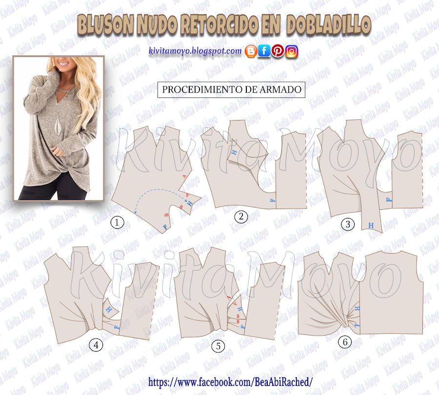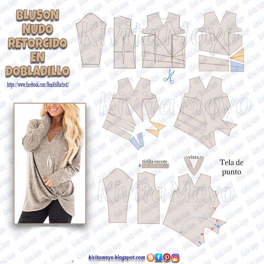 Este modelo es una versión distinta de los nudos drapeados. En este caso las cuatro costuras de su armado están centradas al final de la prenda. Y tiene la diferencia de que las piezas que recrean el anudado están ubicadas en la misma dirección, y no cruzadas como normalmente se ven en este tipo de drapeado.