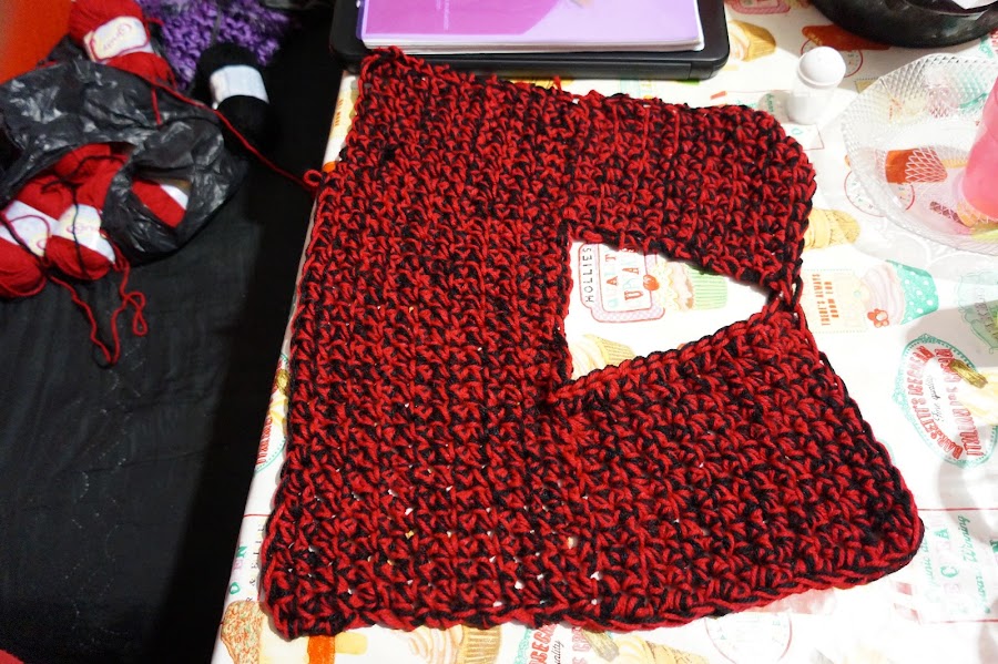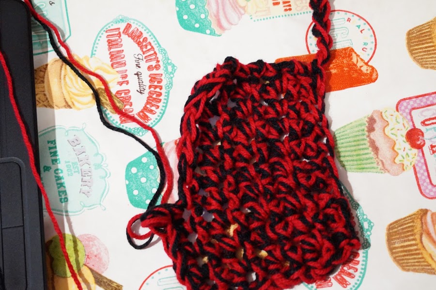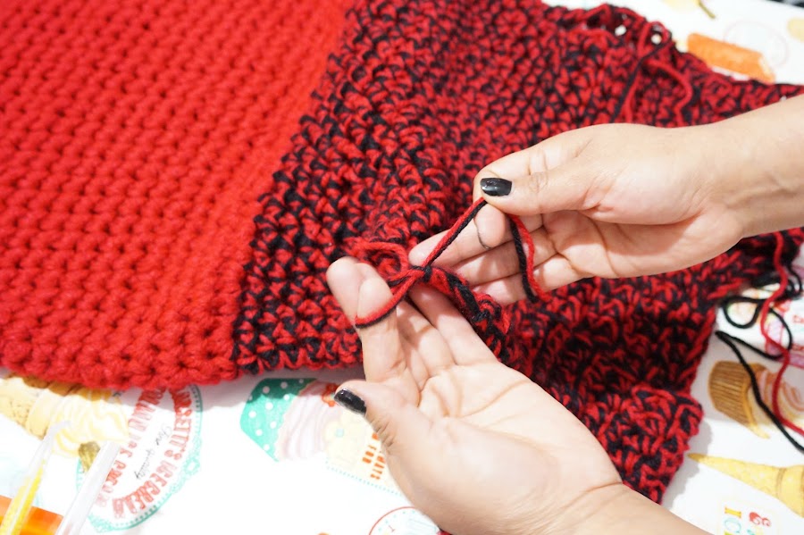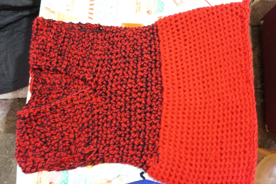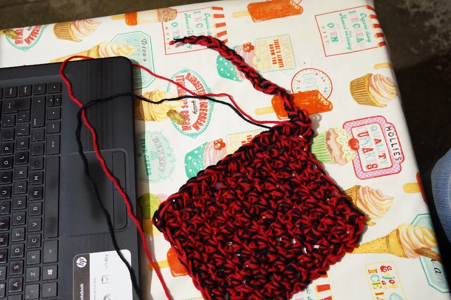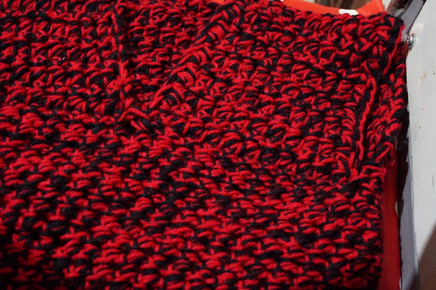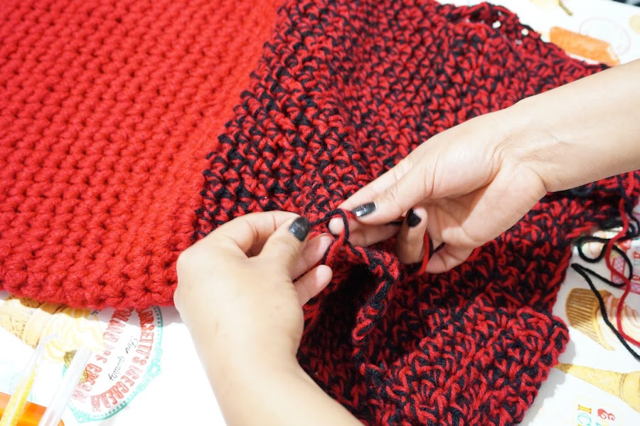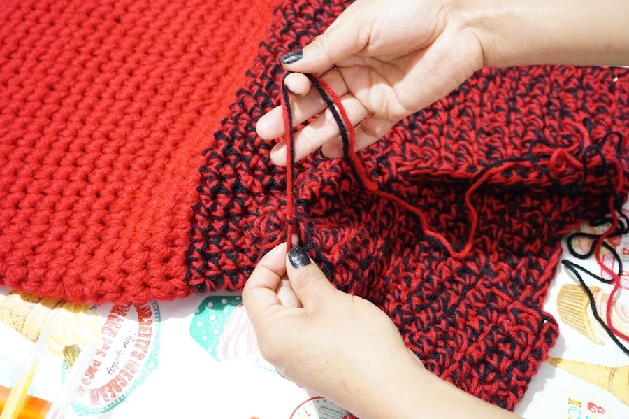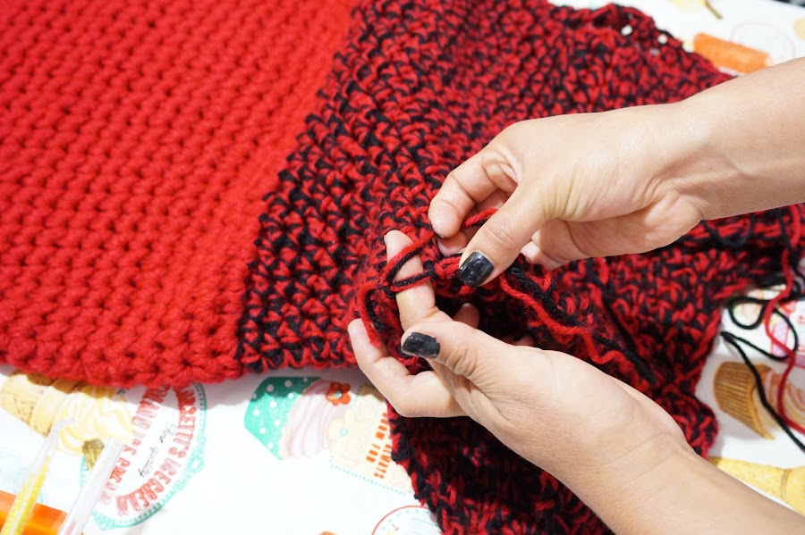 Ya tenemos lista la mayoría de nuestro Blusón tejido con dedos, Ahora cambiaremos el color negro del tejido por rojo, para así tener solo un color y lo que haremos sera tejer la siguiente vuelta dando un poco de amplitud, esto se logra tejiendo sobre una cadena dos cadenas y sobre la siguiente cadena una cadena, lo que resultara en tejer una cadena por dos cadenas una cadena por dos cadenas. Esto terminando solo la primera vuelta de ahí tejeremos las siguientes vueltas de manera normal, es decir una cadena en cada cadena. Hasta alcanzar el largo deseado.