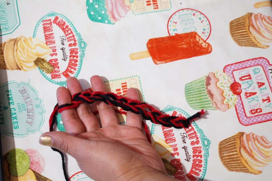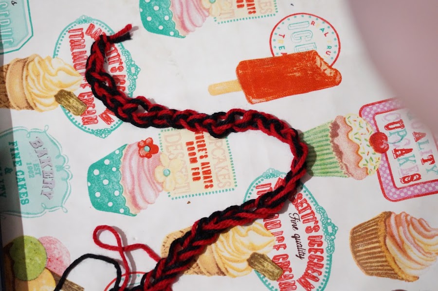 Empezarás haciendo un nudo en los dos estambres de diferente color, ahora realizaras 30 cadenas.