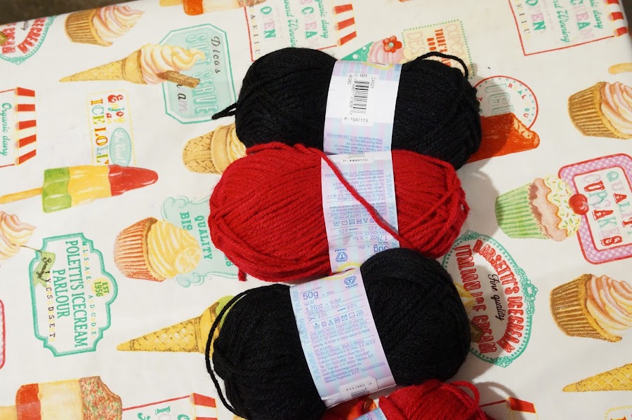 -Estambre de dos colores si tu deseas. (450 g) Si vas a realiza el proyecto como te lo muestro, requieres de 150 g de negro, y 300 g de rojo.