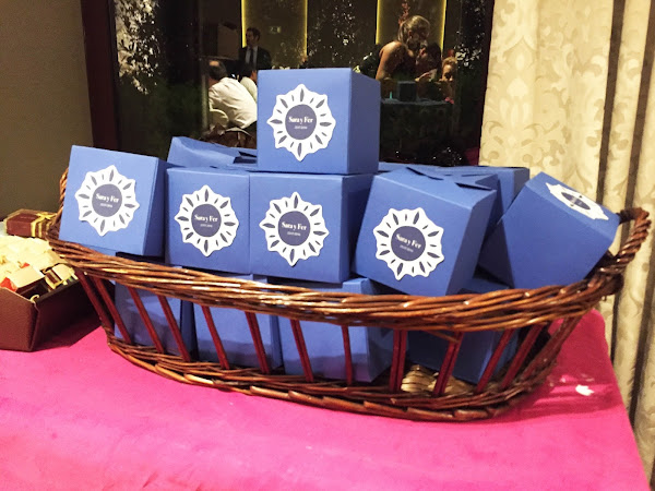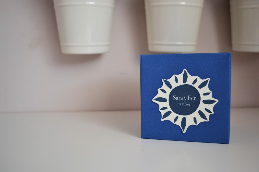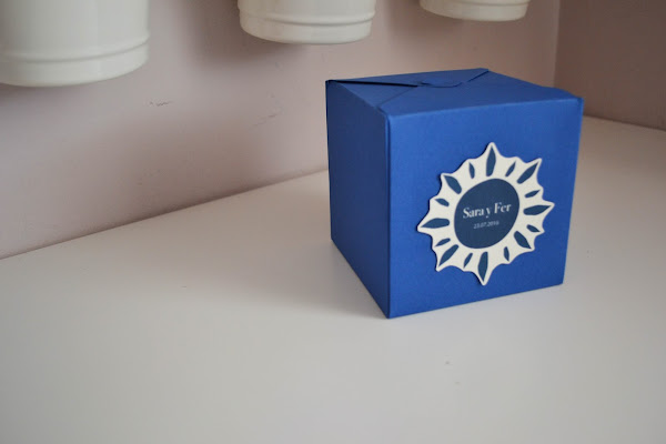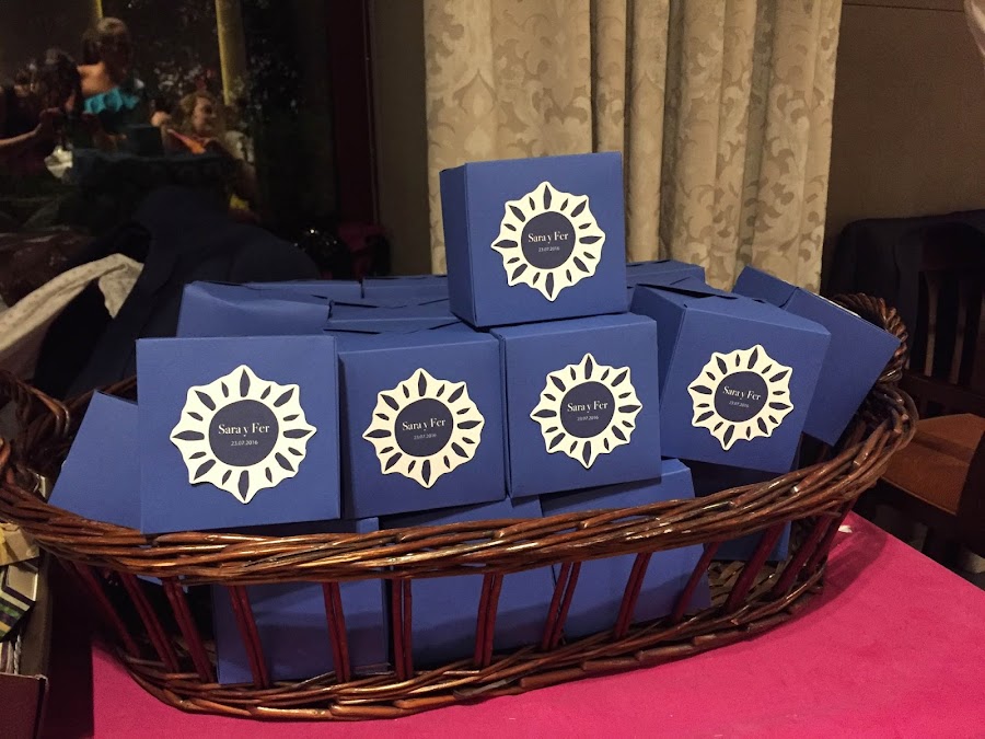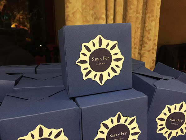 En color azul marino y beige realicé las cajitas de chuches, a juego con el sol que diseñaron para las invitaciones de la boda y este en el centro.