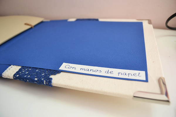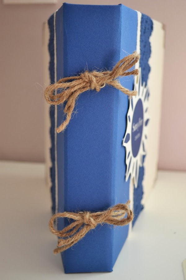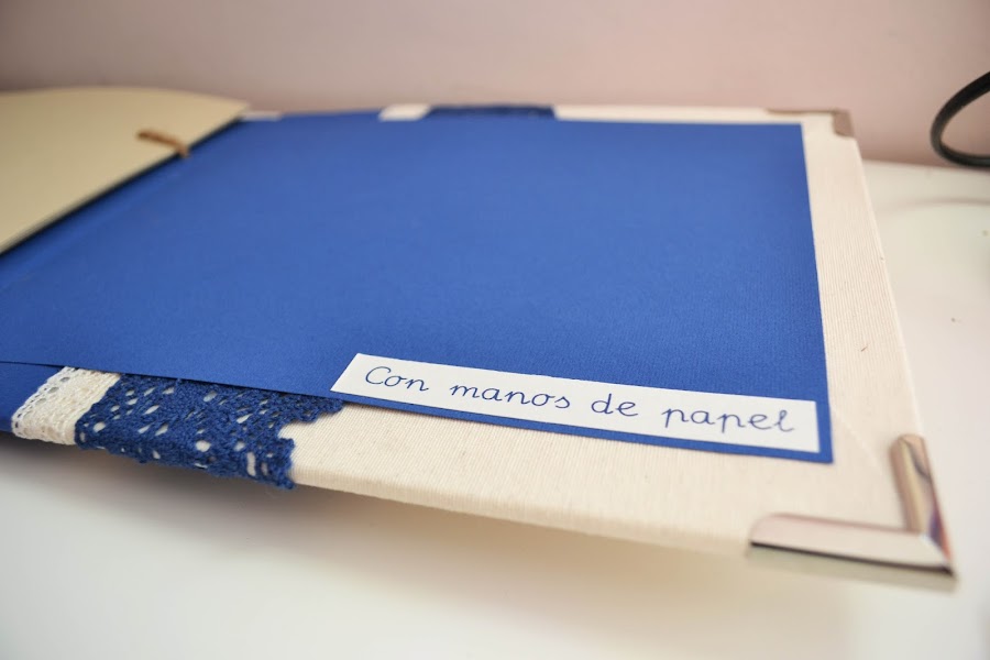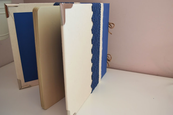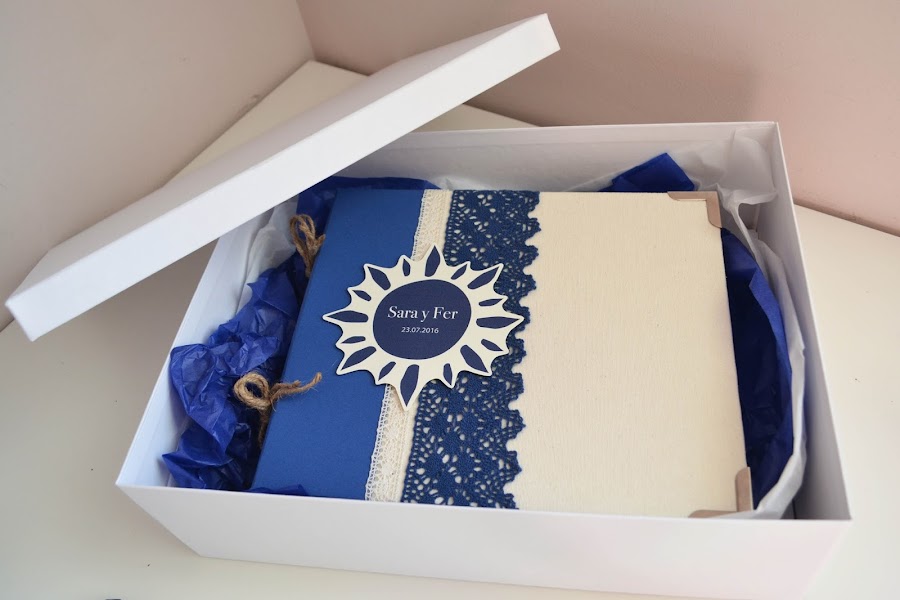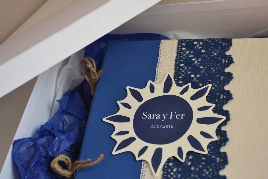 Y para el libro de firmas utilicé los mismos colores. En la portada, de tela beige y papel rugoso azul, he colocado una puntilla estrecha beige y una bastante más ancha azul marino. Las páginas están encuadernadas a la portada con una bonita cuerda de esparto y con la palabra recuerdos impresa en ellas.