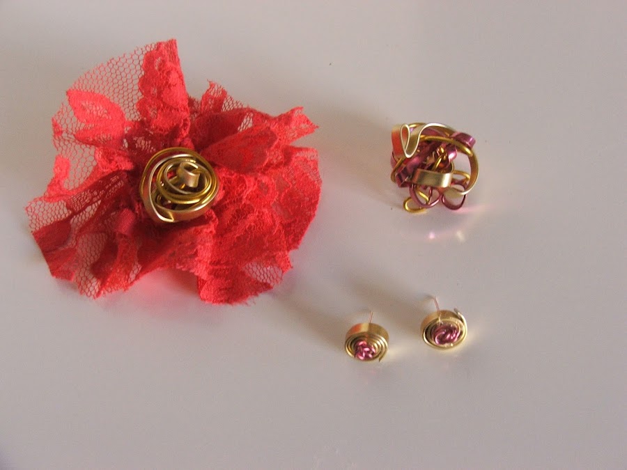 Well, you can see above some other pictures with the dress and the fabrics that I used. And also pictures of the accesories, that are also 100% handmade - a hair flower to go with the dress, a ring and earrings. And you can also see a picture of me and my boyfriend at the weeding, so that you can see how the dress looked when I wore it.