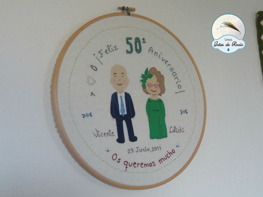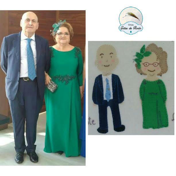 Me pasaron fotos de los homenajeados para que yo preparara una caricatura de ellos dos, y junto con un texto bordado compusieran un cuadro enmarcado en bastidor.