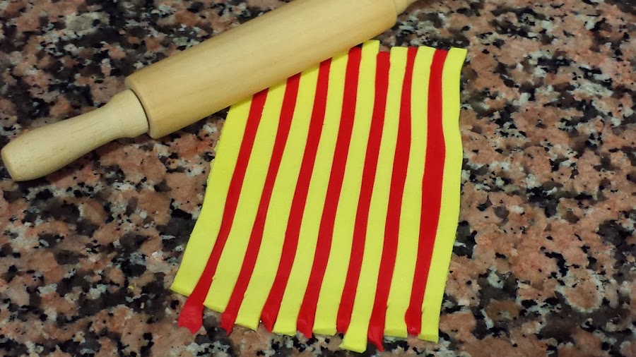 Las galletas están decoradas con fondant. Simplemente se trata de ir haciendo tiras del mismo tamaño y de ambos colores y ponerlas una al lado de la otra consecutivamente. Se amasa para que acaben de enganchar unas a las otras. Finalmente se corta con el mismo cortador que se hizo la galleta y se engancha a ella (a mí me gusta engancharlo con miel, pero últimamente he oído a gente que hasta con agua lo engancha)?