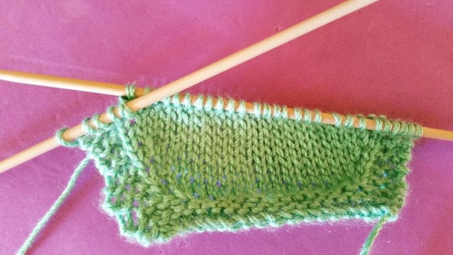 Continuar trabajando 3 puntos bobo en cada lado de los puntos centrales a punto jersey, y al mismo tiempo comenzamos los aumentos POR EL LADO DEL DERECHO a cada lado así: 3 puntos del derecho, 1 punto derecho, 1 aumento (tomando la hebra transversal entre el punto tejido y el que sigue, retorciéndolo) 12p derecho, 1 aumento y 3 puntos derecho.