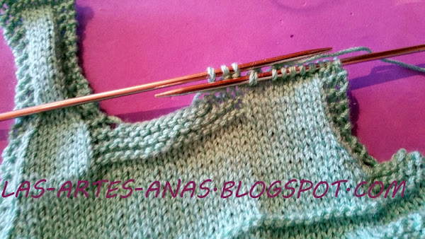 PARA EL ESCOTE, EN la siguiente vuelta, tejer 3 para el orillo,de la sisa, , 8 para el tirante en jersey, 16 en bobo para la base del escote , 8 en jersey para el otro tirante y 3 en bobo para el orillo de la sisa, TEJER DURANTE 3 VUELTAS CON ESA distribución