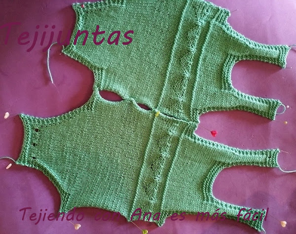 Ahora MENGUAMOS 4 PUNTOS A CADA LADO PARA formar las sisas , tenemos ahora 42 puntos, tejer 3 puntos bobo a ambos lados y tejer en punto media los centrales.