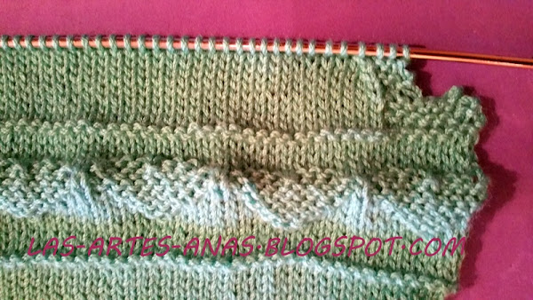 En la siguiente vuelta trabajar 8 puntos bobo en ambos laterales y los del centro punto jersey , tejer 2 vueltas más de la misma manera,