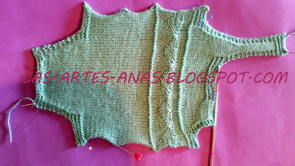 TEJER, A CONTINUACIÓN 4 VUELTAS MÁS, CUIDANDO QUE LOS 8 PRIMEROS Y LOS 8 ÚLTIMOS SEAN A PUNTO BOBO, los restantes 34 puntos centrales a punto jersey, tendremos 20 cms más o menos a partir de los aumentos laterales