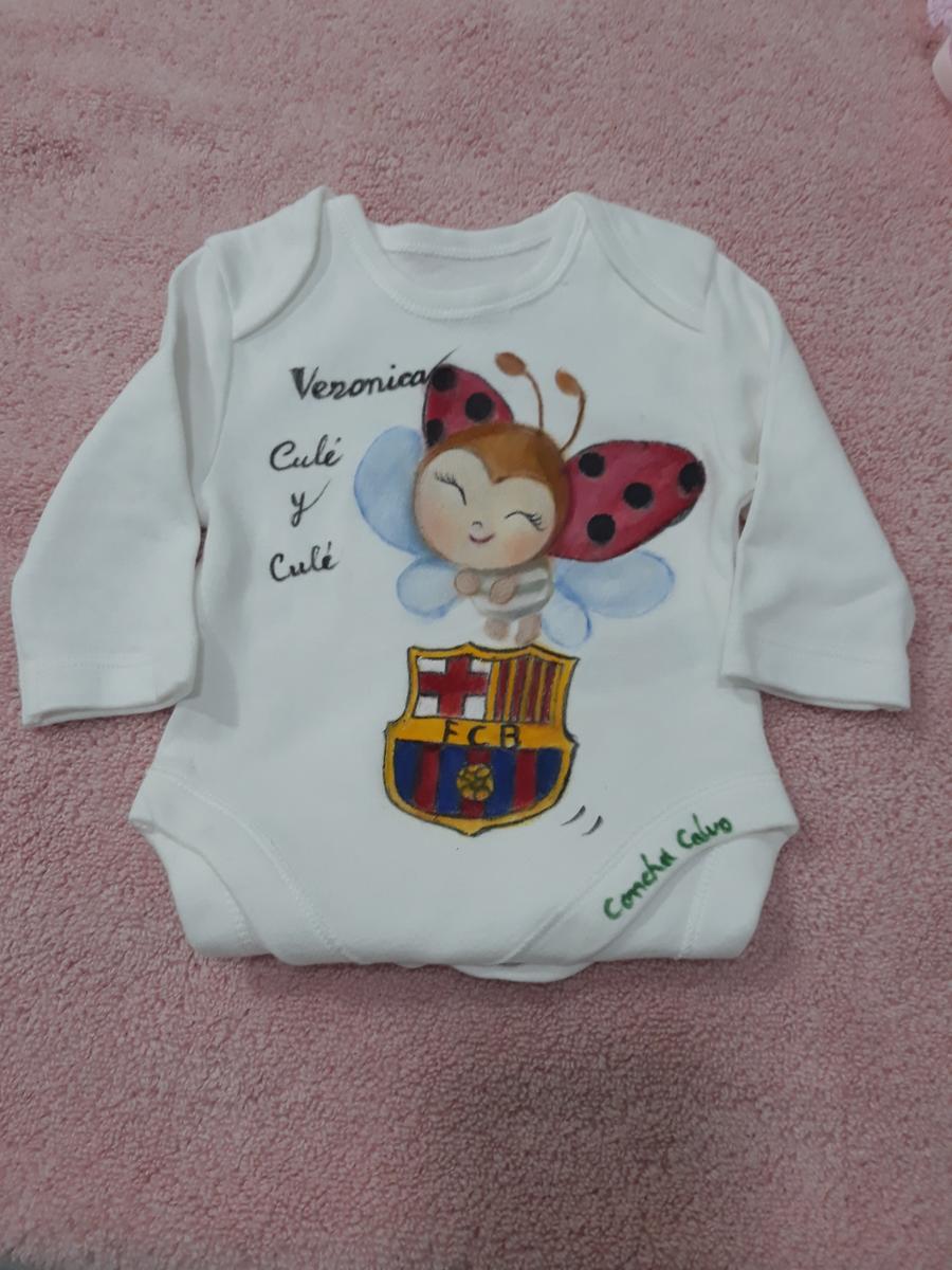 Así que pensando y pensando, se me ocurrió qué aunque a sus padres les guste mucho el escudo del Barsa, ella no deja de ser un bebé y le he pintado así los bodys, la capa de baño y el cambiador. Poniendo el escudo, pero haciendolo un poco simpático con los muñequitos, y mirá, acerté, me haan mandado un Wasap, diciendome que les ha gustado mucho y dandome las gracias.