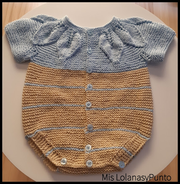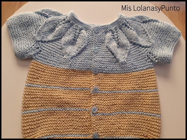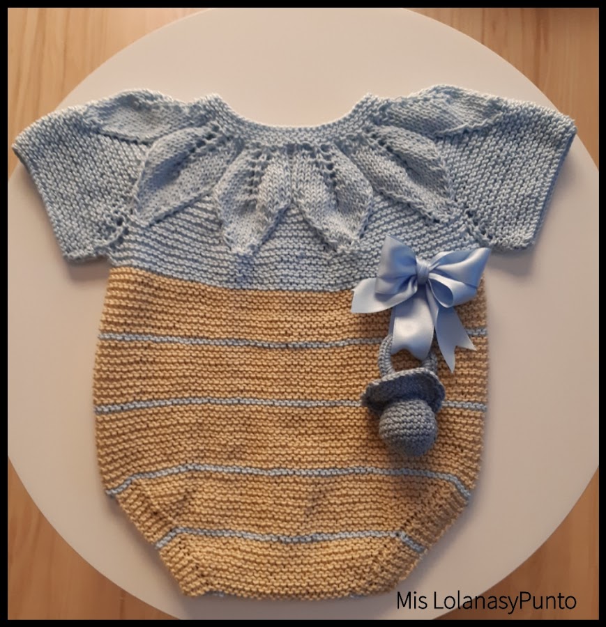 El patrón real, lleva en la parte del cuerpo otro punto, pero yo a falta de hilo, lo he tejido a punto del derecho o punto bobo. Con esas dos pasadas, para hacer contraste en color celeste como el canesú.