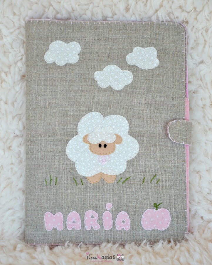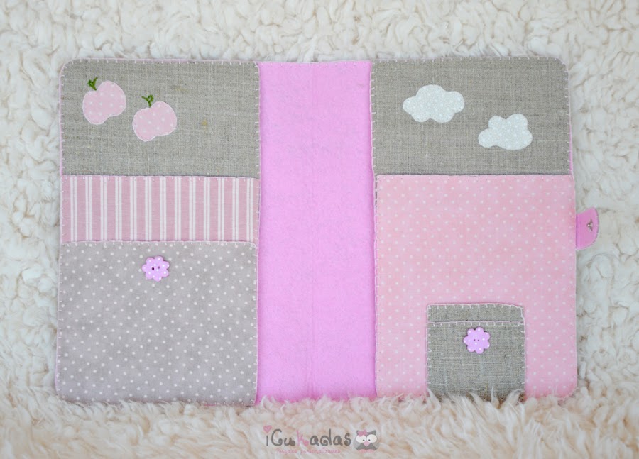 Y el portadocumentos igual, personalizado, en rosa o en azul, con lino de alta calidad, telas japonesas, y aplicaciones de fimo.