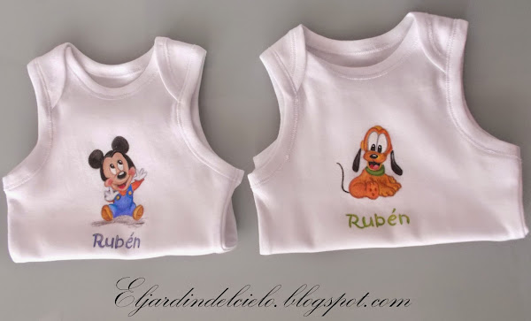 Esta semana he pintado estos bodys para Rubén que acaba de nacer. Los dibujos los han elegido mis hijas porque querían llevárselos ellas.