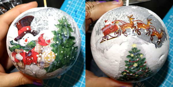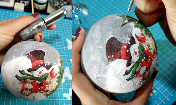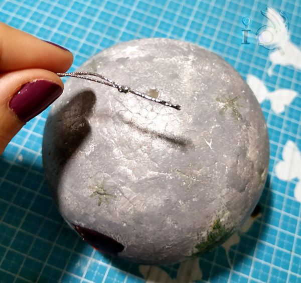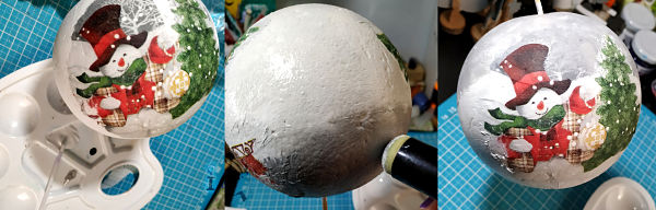 Yo lo hice antes de barnizar la bola, pero en realidad os recomiendo que primero barnicéis y luego pintéis si lo vais a hacer con pintauñas, porque debe tener alguna sustancia que afecta al polispán, y quedó con cierto relieve hacia adentro.