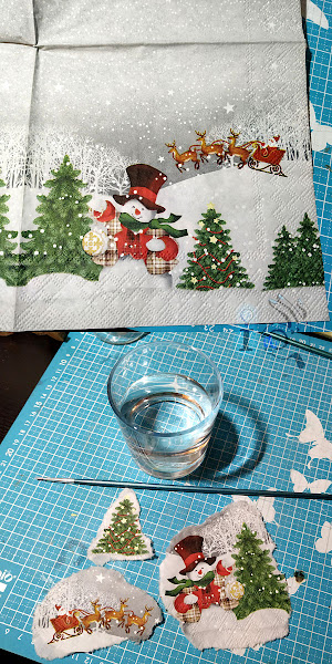 Cuándo está seca lo que vamos a hacer es un decoupage sobre ella. Yo utilizo esta servilleta tan mona, y corto los motivos que quiero rodeándolos con un pincel fino humedecido y rasgando luego por ahí la servilleta. Al rasgar la servilleta luego será más fácil integrar los dibujos con el fondo.