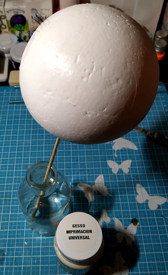 Para que luego todo agarre bien sobre la bola lo primero que hacemos es darle una imprimación. Por ejemplo gesso blanco, aunque también valdría una todoterreno.