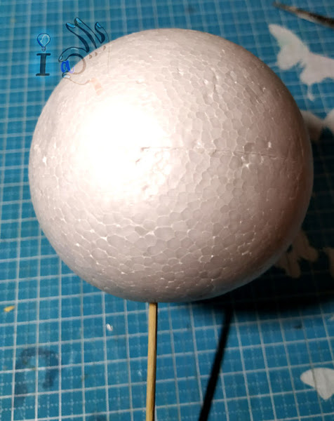 Hacerla es muy sencillo y además no necesita muchos materiales. Partimos de una bola de polispán, porex, corchopán o como se llame en vuestra zona. Si es grande os cabrán dibujos más grandes. Yo he utilizado una de 10cm. Para trabajar mejor con ella lo primero que vamos a hacer es pincharla en un palito de brocheta, y así la podremos sujetar por ahí para trabajar en la bola.