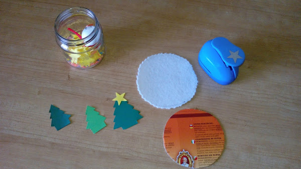 - Folios de colores y maquina de troquelar para hacer los confetis y la estrella (si no tenemos maquina no pasa nada, pueden pintar los arboles los niños)