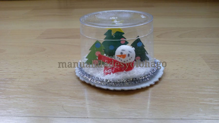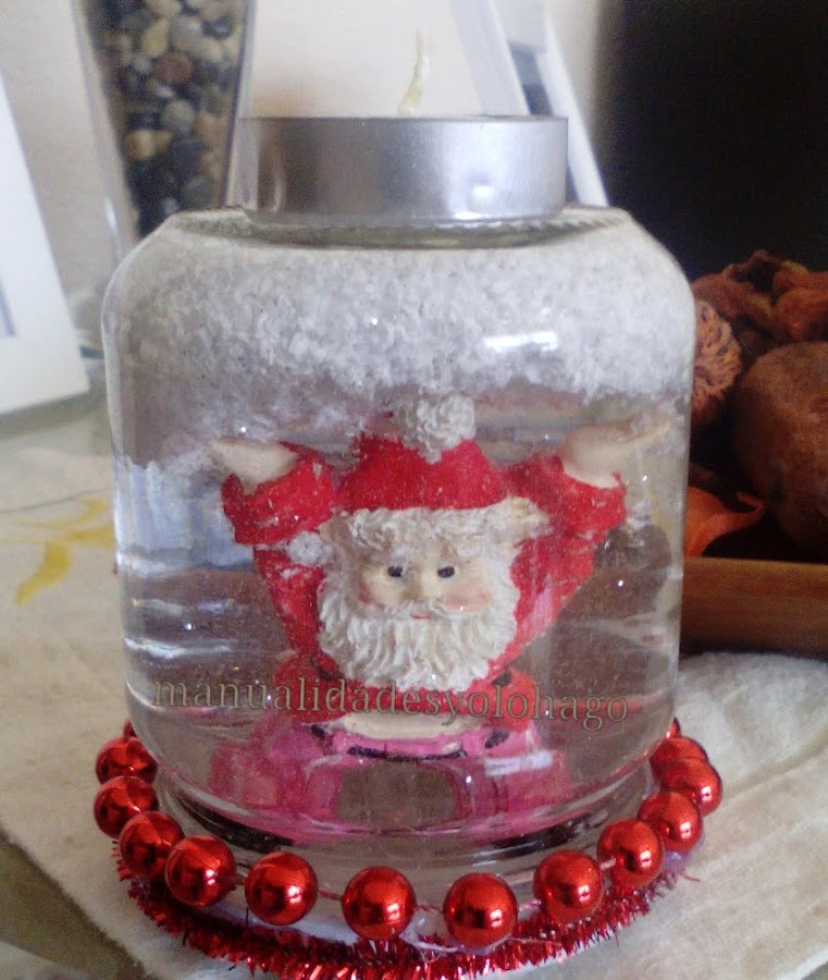 Os enseño este otro modelo con tarro de cristal reciclado, para niños mas mayores puede ser una buena idea, ponemos dentro una figura de plástico, agua destilada y purpurina, estrellas ,,,lo que queramos y rematamos la tapa con lo que mas nos guste y yo he puesto una vela arriba,