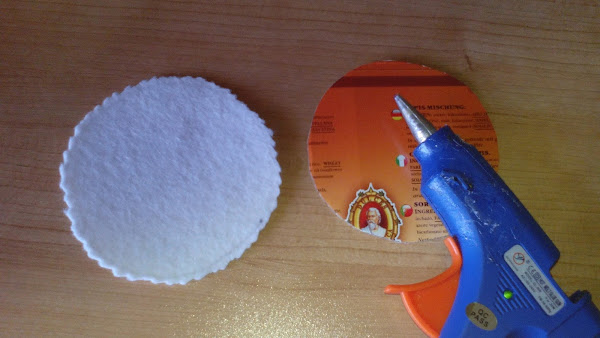 Utilizamos el vaso boca abajo para hacer el patrón de la base, recortamos el fieltro y el cartón y lo unimos con silicona.