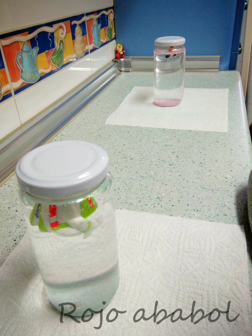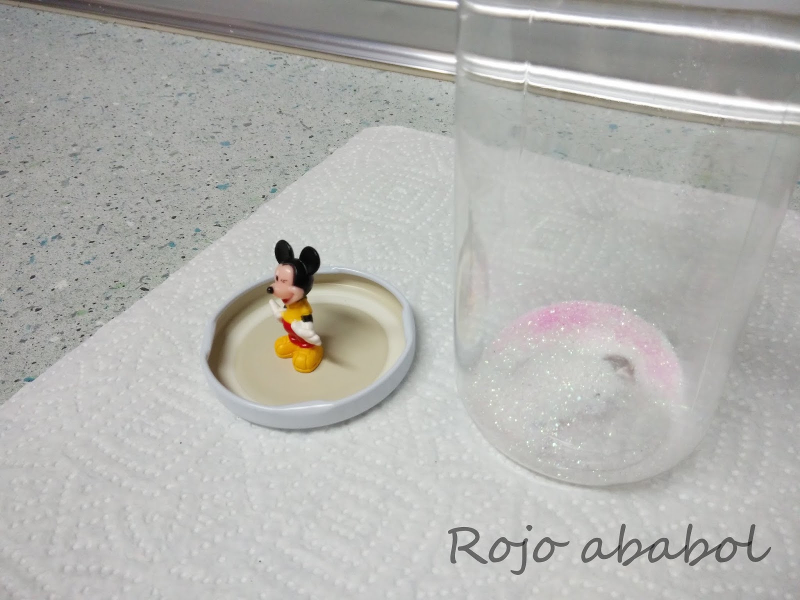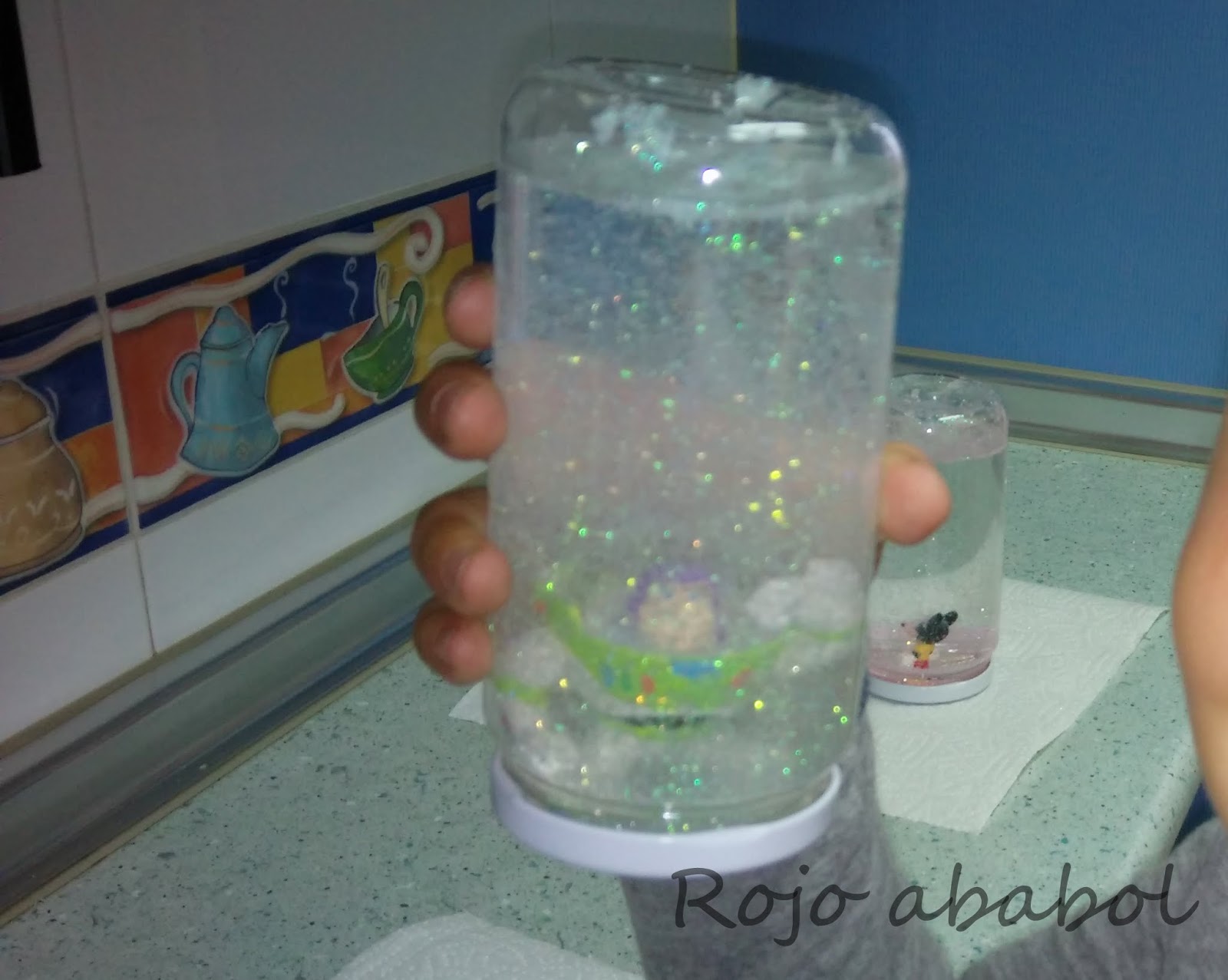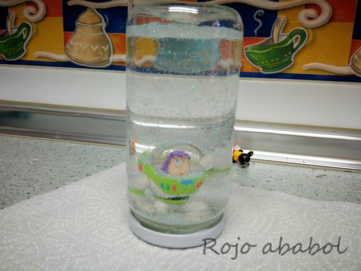 Así que nos dispusimos el bollito y yo a preparar todo para fabricar nuestra super bola de nieve y purpurina.