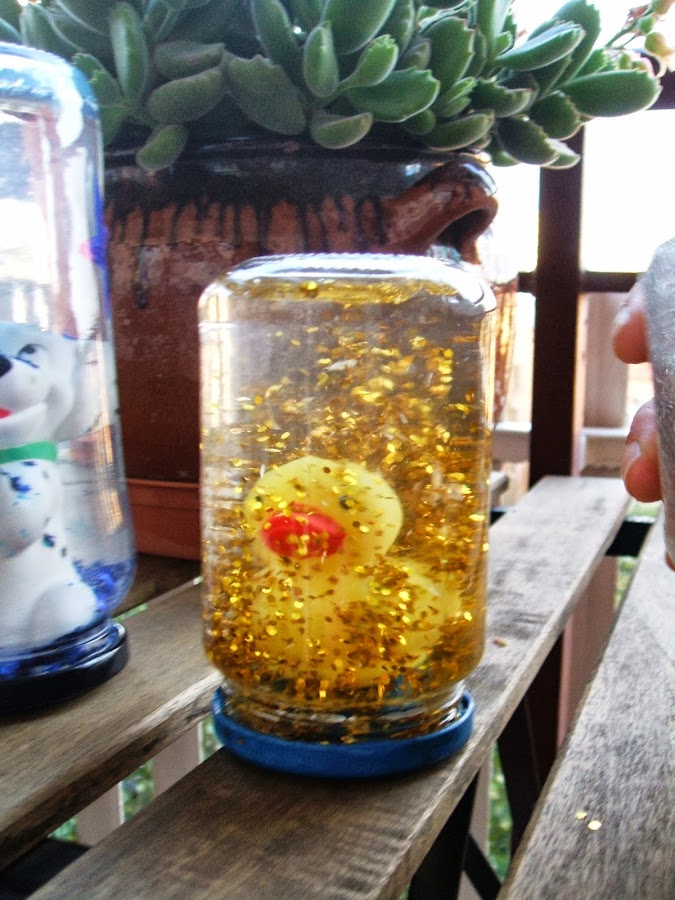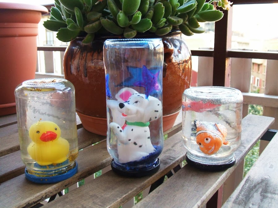 Aquí tenéis tres bolas de nieves-purpurina con muñequitos de mi hija.