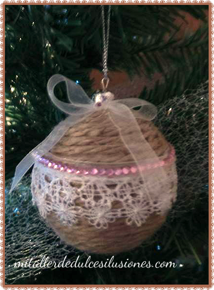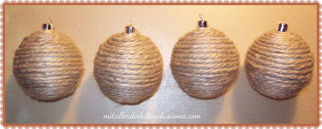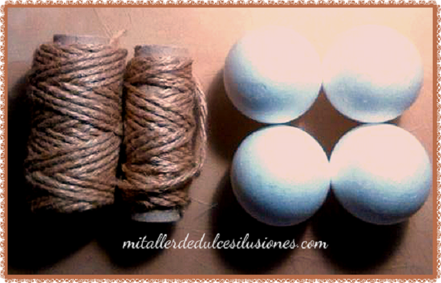 2. Cogemos las bolas de poliexpan,yo en mi caso he hecho 4 modelos diferentes,comenzáis a pegar la cuerda por la parte de abajo de la bola de corcho y en redondo,con la pistola de pegamento caliente es rapidísimo,forráis vuestras bolas con la cuerda y en la parte de arriba pegáis un enganchito para bolas de navidad,sino tenéis con un trocito de cinta os servirá para poder colgar las bolas.