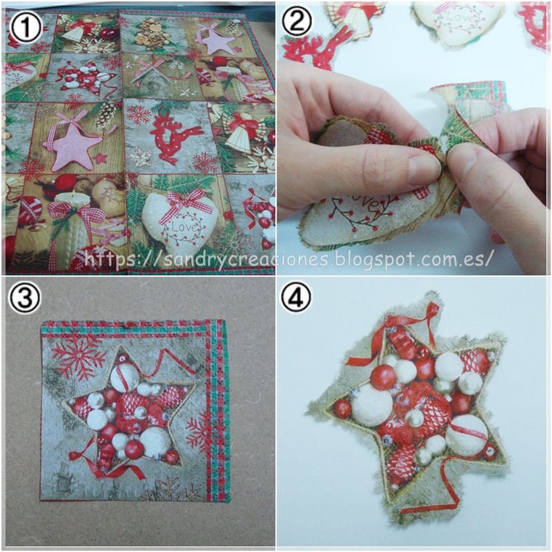 Tanto para decorar las bolas de porex como la de plástico seguimos el mismo procedimiento. Primero cogemos una de las servilletas (imagen 1) y le sacamos las 2 capas de debajo quedándonos solo con la de los dibujos y, con mucha paciencia, vamos recortando los motivos que queramos con las manos (imagen 2) para que una vez que los peguemos queden mejor integrados en la superficie de las bolas y no se vea un corte demasiado pulido como el de las tijeras. En las imágenes 3 y 4 podéis ver cómo queda la estrella una vez recortada con las manos.