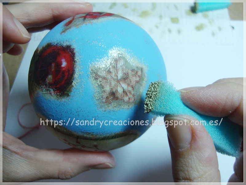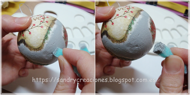 Una vez hecho esto y para integrar mejor los motivos aplicados con decoupage hicimos una mezcla de colores ocre y gris hasta obtener un color beige parecido al del fondo de los dibujos y con la ayuda de una esponja fuimos aplicándolo alrededor de cada motivo. Esta vez escurrimos mucho la pintura de la esponja con la ayuda de papel de cocina para que no pintara mucho, como la técnica del pincel seco, ya que solo nos interesaba difuminar los bordes de los motivos de servilleta. Completamos la decoración con una mezcla de pinturas metalizadas dorada y plateada que fuimos aplicando también con la esponja muy escurrida alrededor de los motivos y también por toda la superficie de la bola.