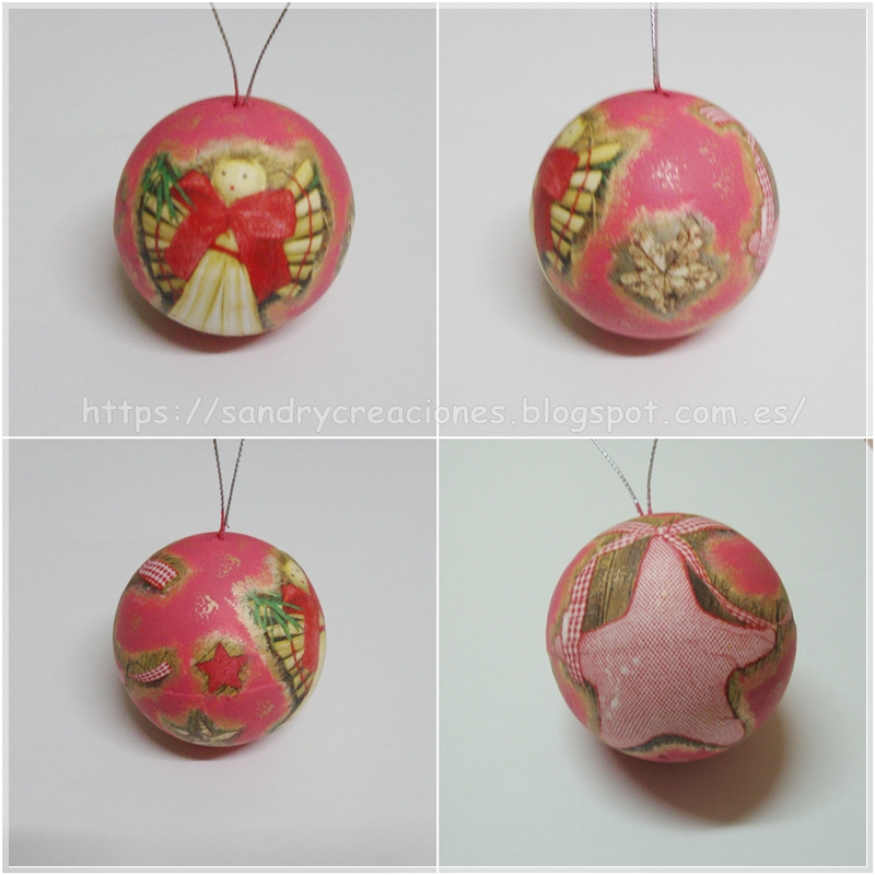 A nosotros nos quedó alguna arruga, en especial en los motivos más grandes y para quitarlas o intentar disimularlas usamos film transparente (del que se utiliza en la cocina para envolver comida) y con mucho cuidado los pusimos sobre cada motivo e intentamos extender las arrugas presionando ligeramente sobre el film de plástico con los dedos. Y así fuimos haciéndolo con todos los motivos que quisimos poner en las tres bolas y dejamos secar. De esta forma conseguimos quitar muchas de las arrugas y las más grandes se disimularon bastante y por ser la primera vez que hacíamos decoupage sobre una superficie redonda nos quedamos satisfechos con el resultado y con ganas de seguir experimentando.