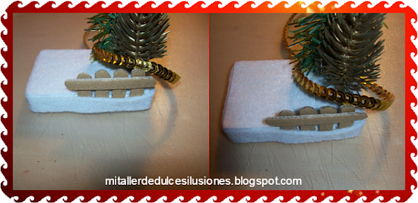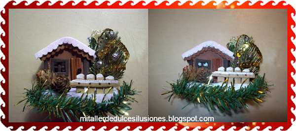 5.La casita la he hecho de goma eva,muy sencillita,si pincháis AQUÍ ,son como las que hice de pajaritos,pero muy pequeñas y con ventanita y puertecita,la nieve en el tejado es goma eva de purpurina blanca y la puerta unos palitos de madera,cositas que podéis ir ideando sobre la marcha.