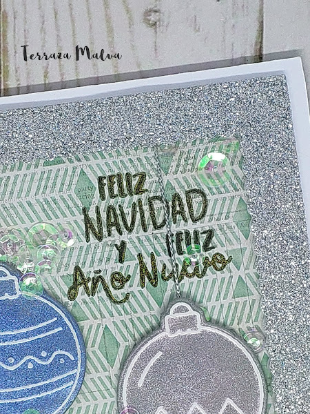 El marco está troquelado en papel purpurina plateado, del mismo tono que los cordones de las bolas de navidad.