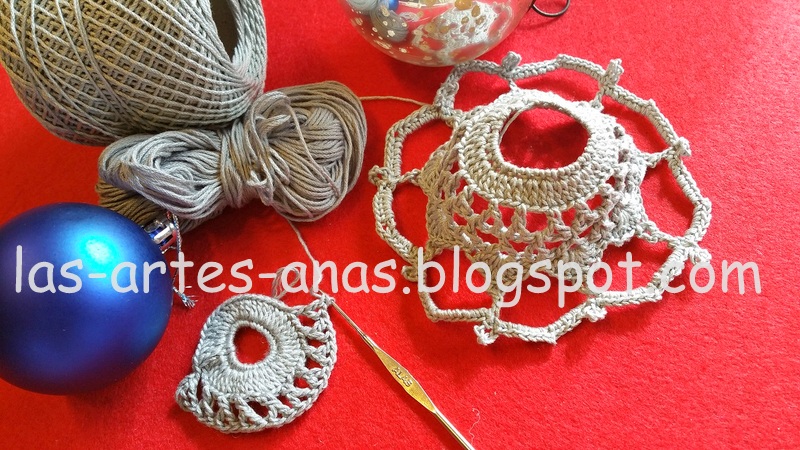 este es el motivo para la bola bicolor, pinchar, ES PUNTO PIÑA, en color blanco roto y 2 o 1 pasada a punto red, en gris, y en cada 2 espacios hacer medios puntos de 5 separados por 2 cadenetas