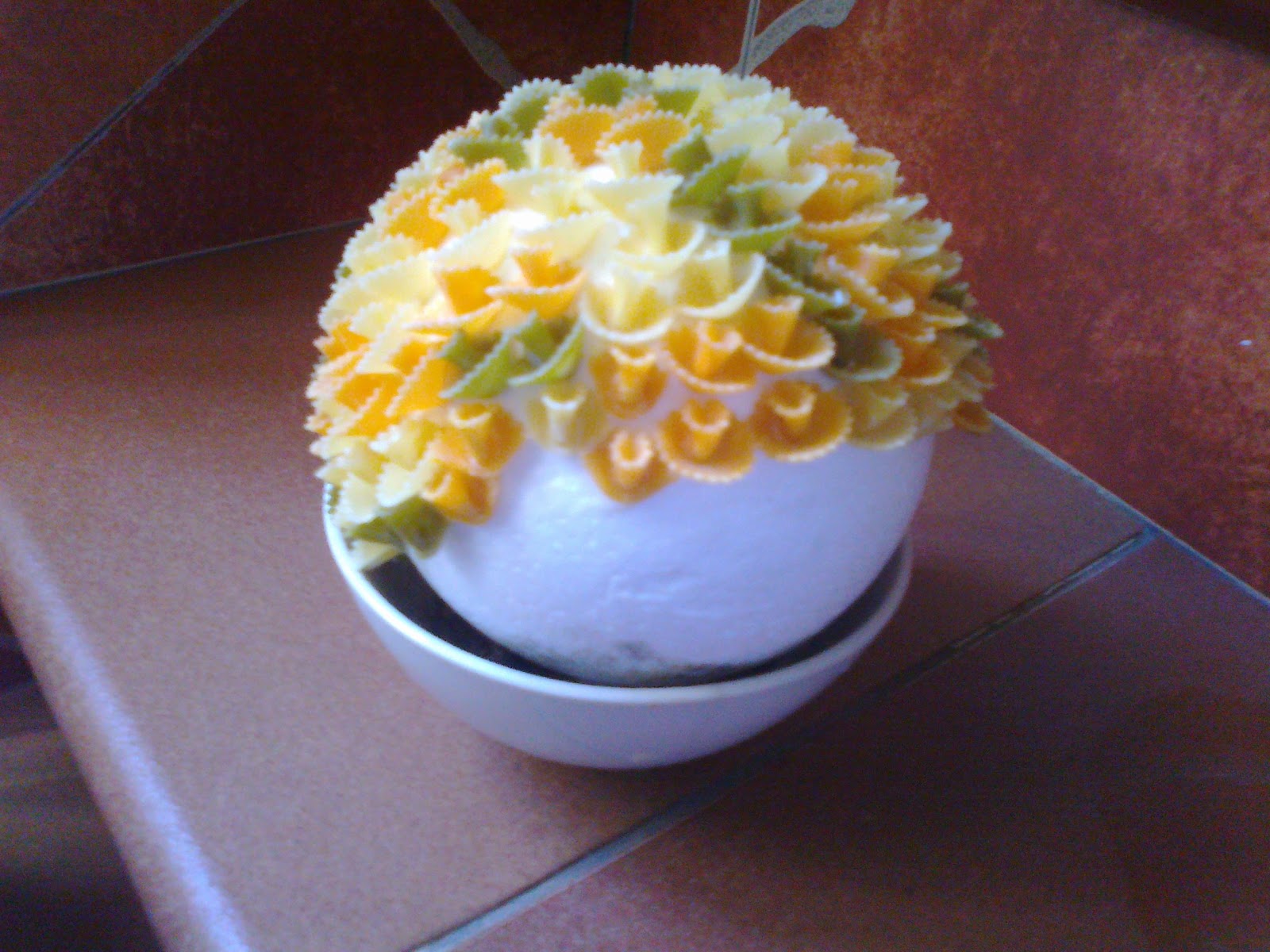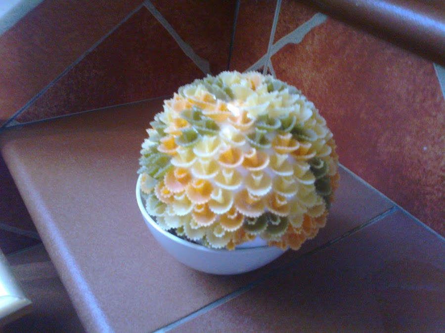 En primer lugar se coge la bola de corcho y se pinta con el color escogido, más tarde cuando está este seca, se le va pegando la pasta con la cola, se aconseja desde el medio de la bola hacia los extremos y siempre de forma ordenada para q la forma quede bien,