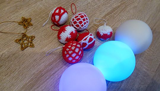 Retomamos la esfera: 13. Cuatro puntos bajos, una disminución. R (tejes un punto bajo enganchando dos de la hilera anterior). 30 pb. 14. Tres pb, una disminución. R. 24. 15. Dos pb, una disminución. R. 18. 16. Un pb, una disminución. R. 12. Rellenar. 17. Todo disminuciones. 6. Cerrar y dejar un bucle de hilo para colgar la bola del árbol.