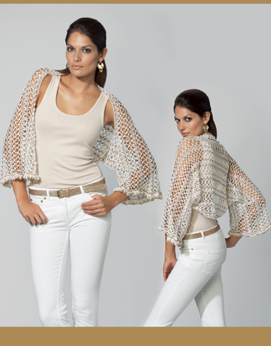Se llama Azahar y es de la marca Katia. El bolero te le haces en un boleo pero el precio del hilo es otra historia, solo se necesita una de estas madejas que en la tienda que he preguntado cuesta casi 7 euros más las madejas de hilo de algodón necesarias para hacer las cadenetas de unión de las tiras,otros dos ovillos.