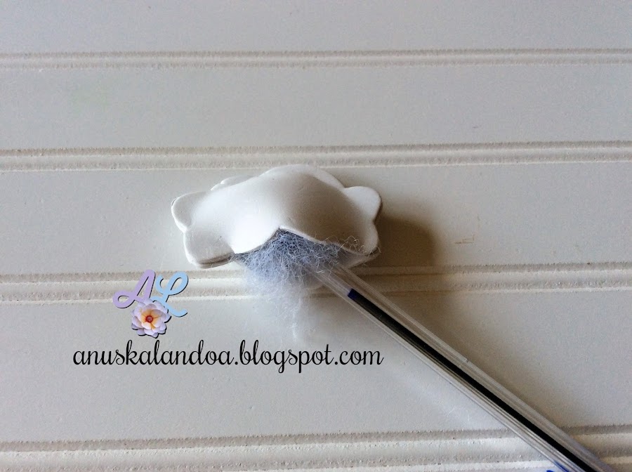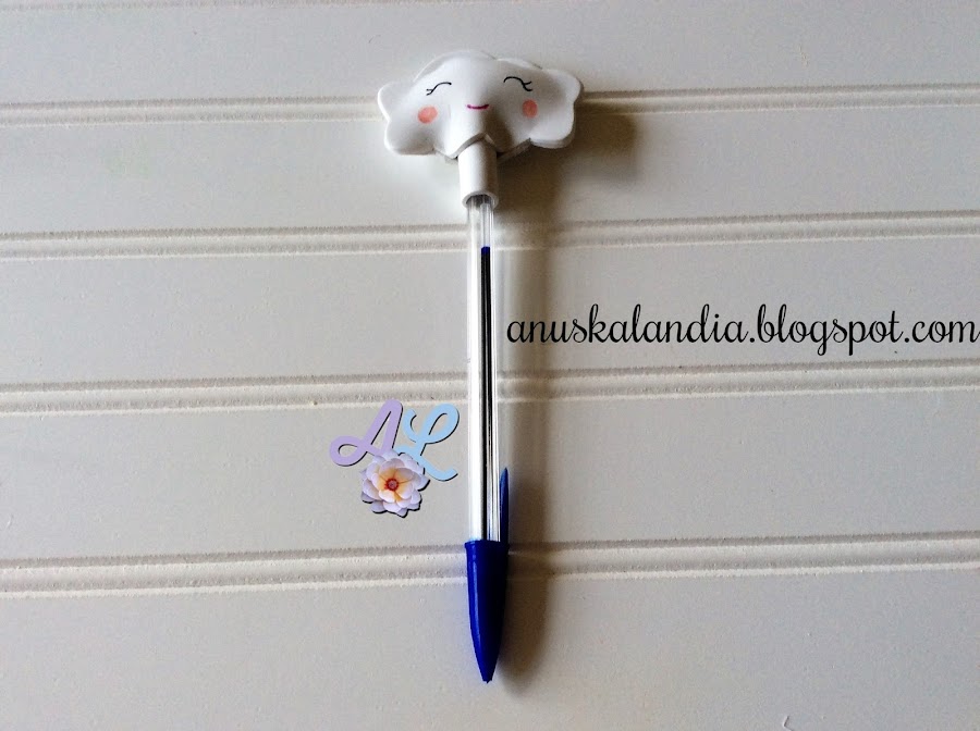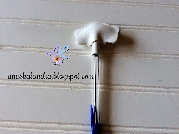 - Le ponemos un poquito de pegamento en ambos lados internos de la nube, donde dejamos abierto. Introducimos el boli con nuestro capuchón blanco, pegamos y cerramos.