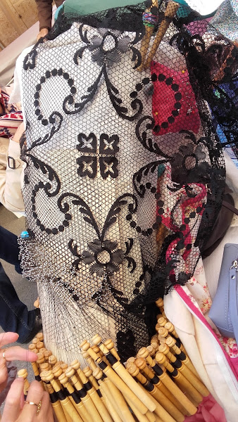Además conocí a Julia Domenech, profesora de bolillos de Alcacer que lucía un cuello de encaje ruso espectacular, y a su marido quien me comento que de tanto ir con su mujer a los encuentros acabo aprendiendo a hacer encaje, y os aseguro que el trabajo que estaba haciendo es de los que mas me gustan entre otras cosas porque esta realizado en colores.