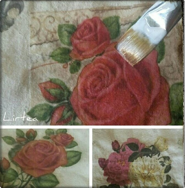 Tened en cuenta que la servilleta transparente siempre la base, así que conviene hacer el decoupage sobre una base clara, para que no pierda intensidad de color.