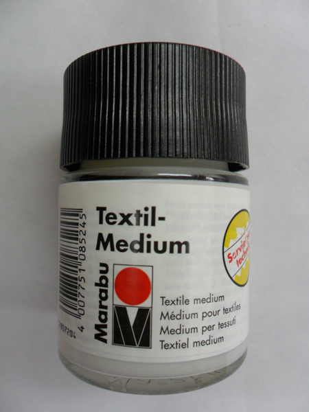 El médium que se utiliza es especial para textiles. Aquí no podemos utilizar la cola blanca ni alkil, así que el médium textil es algo esencial( este médium textil sirve también para hacer decoupage sobre madera y para transfer por si no quereis acumular material).El médium o pegamento textil, se utiliza sin diluir con agua.