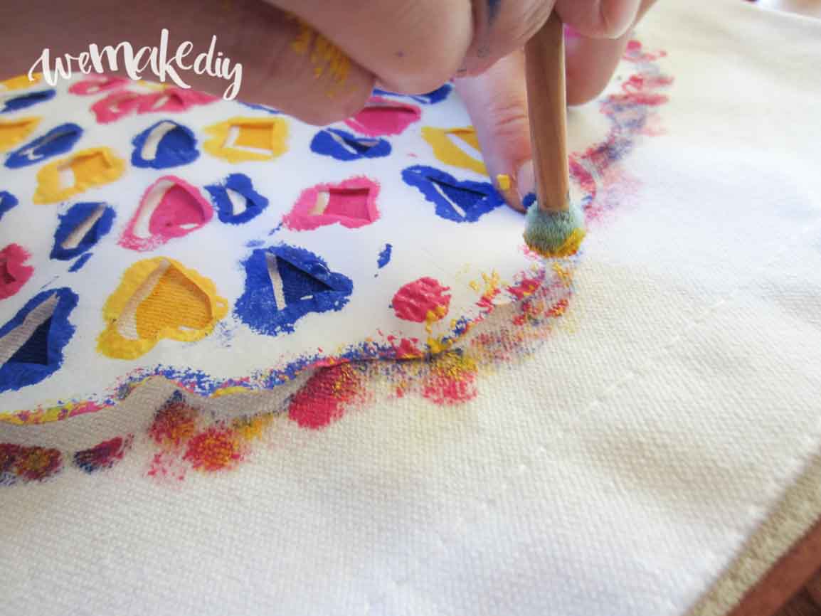 Abre los tres botes de pintura y coge el pincel de estarcir. Ve pintando los huecos de la plantilla a tu gusto mediante la técnica de estarcido.