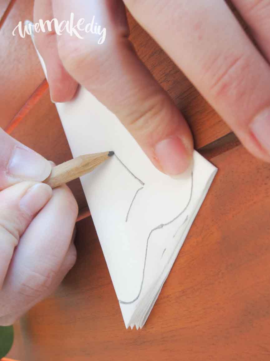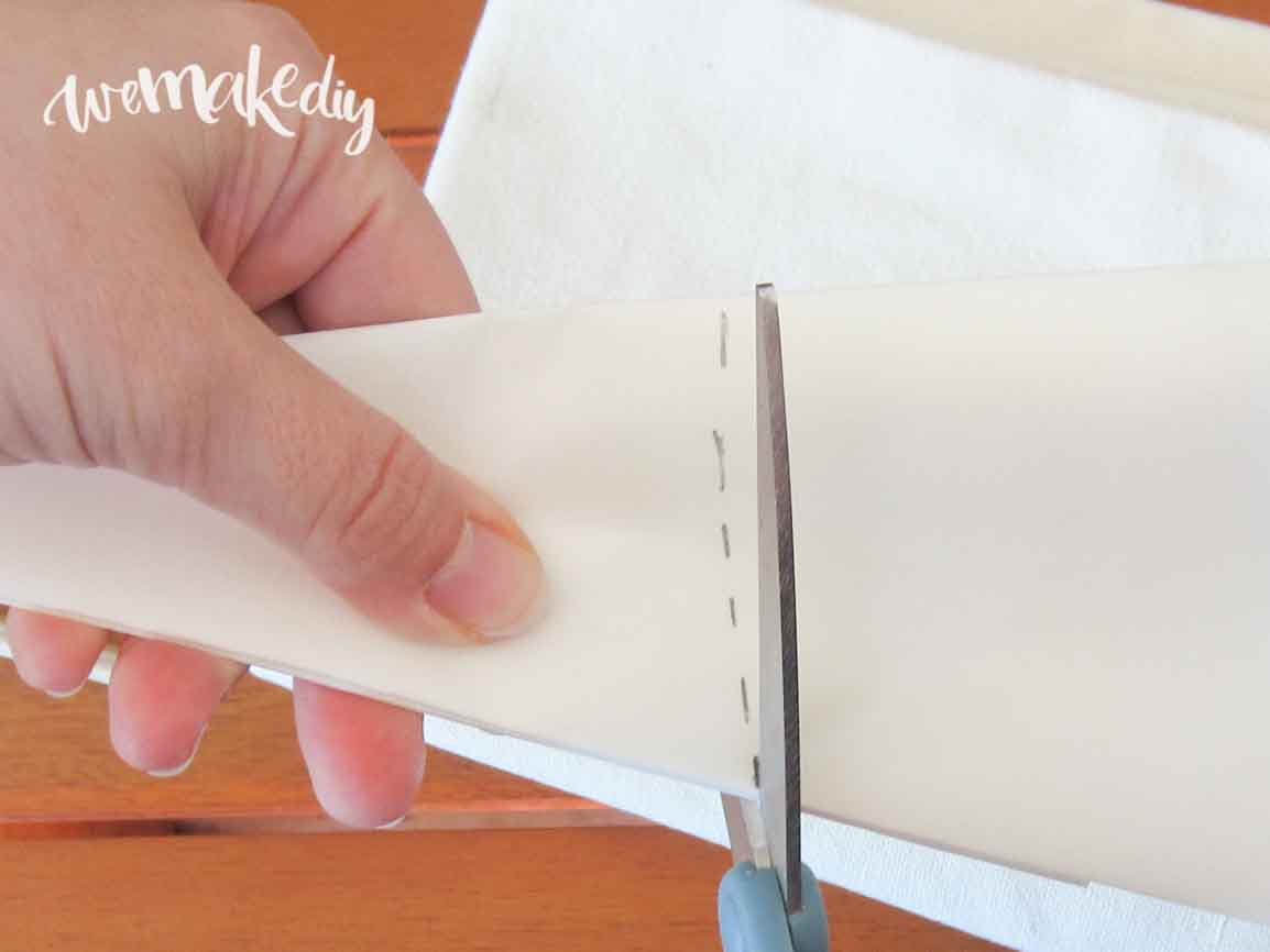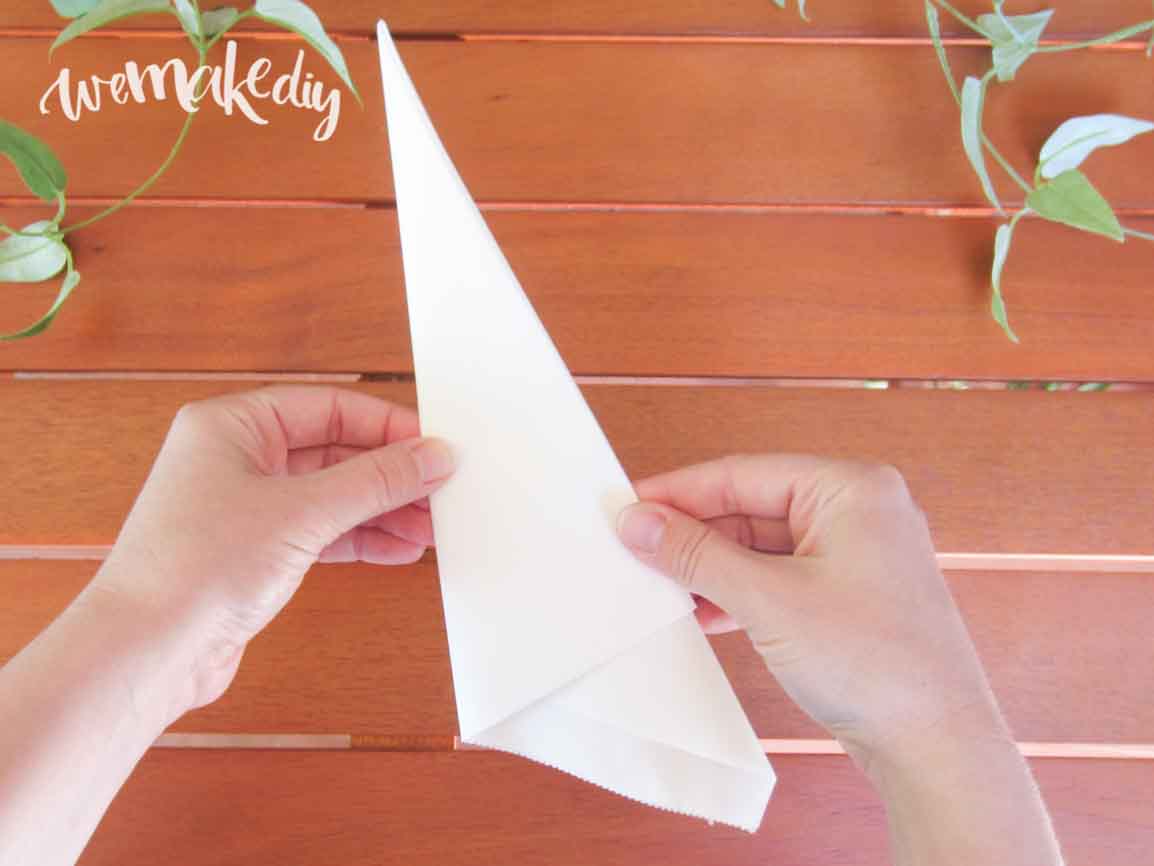 Sobre este cucurucho pintarás las guías para tu mandala,pero primero corta el sobrante de papel para que no sobresalga de la bolsa. Para ajustar la medida, dobla la bolsa por la mitad dos veces y pon el cucurucho encima. Marca el papel que sobresalga de la bolsa y córtalo con las tijeras.