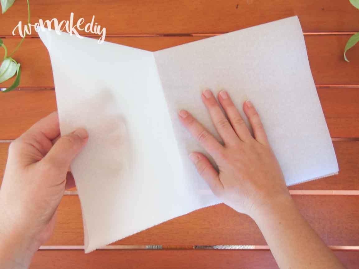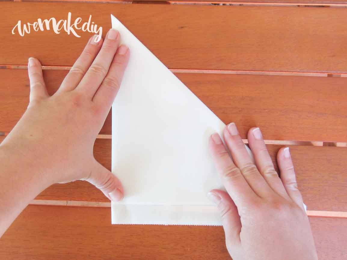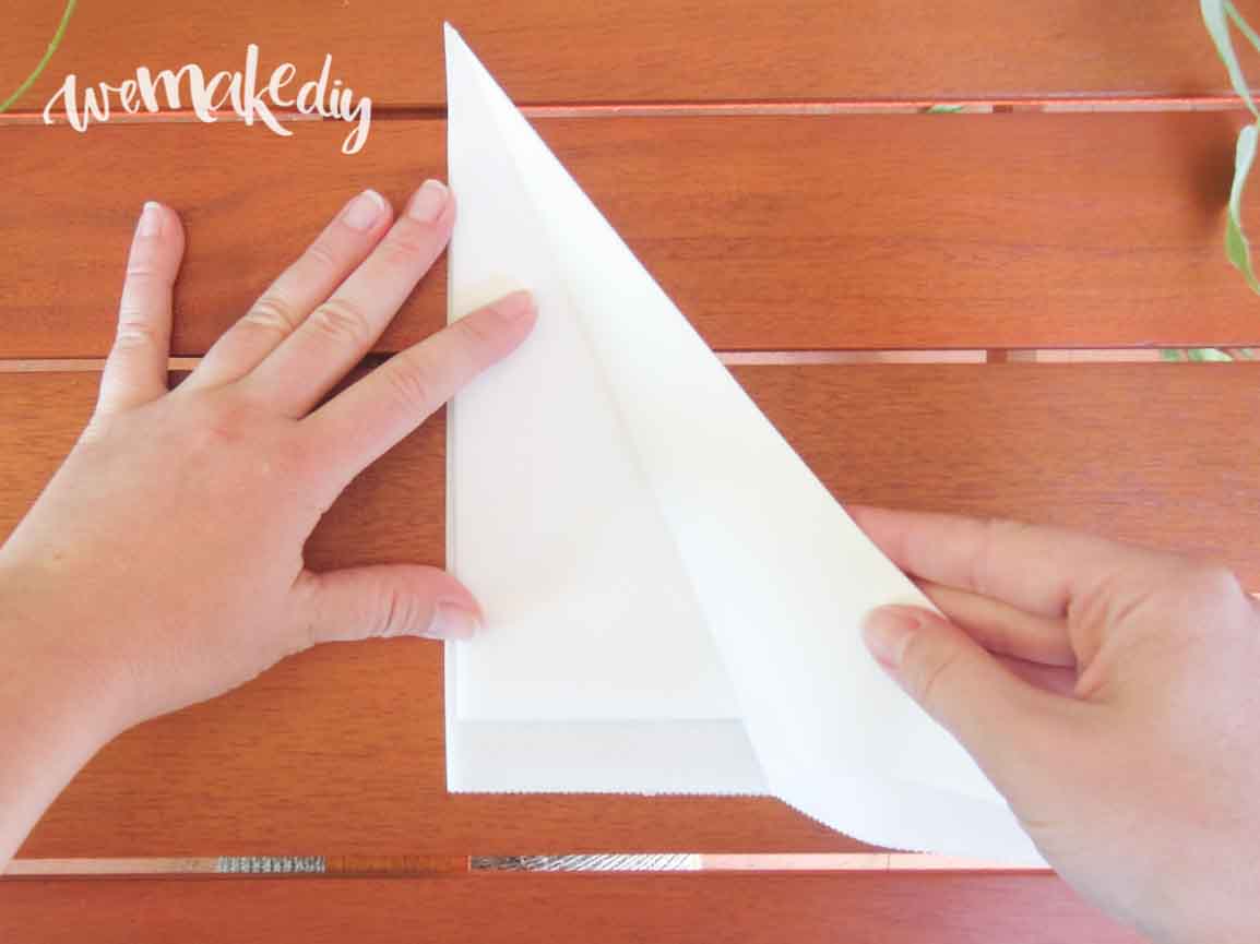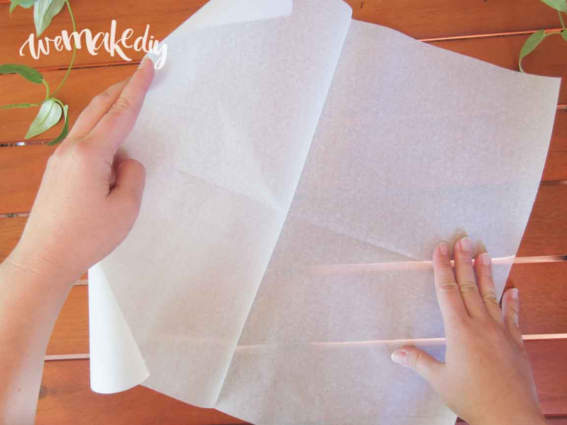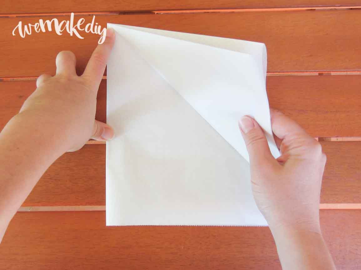 Para hacer el mandala de 8 lados, debes coger el papel anti-adherente y doblarlo por la mitad (imagen 1). Después, vuelve a doblarlo por la mitad (2) de manera que quede sólo un vértice cerrado (es decir, dobla el papel en cuatro como si fuera una servilleta).