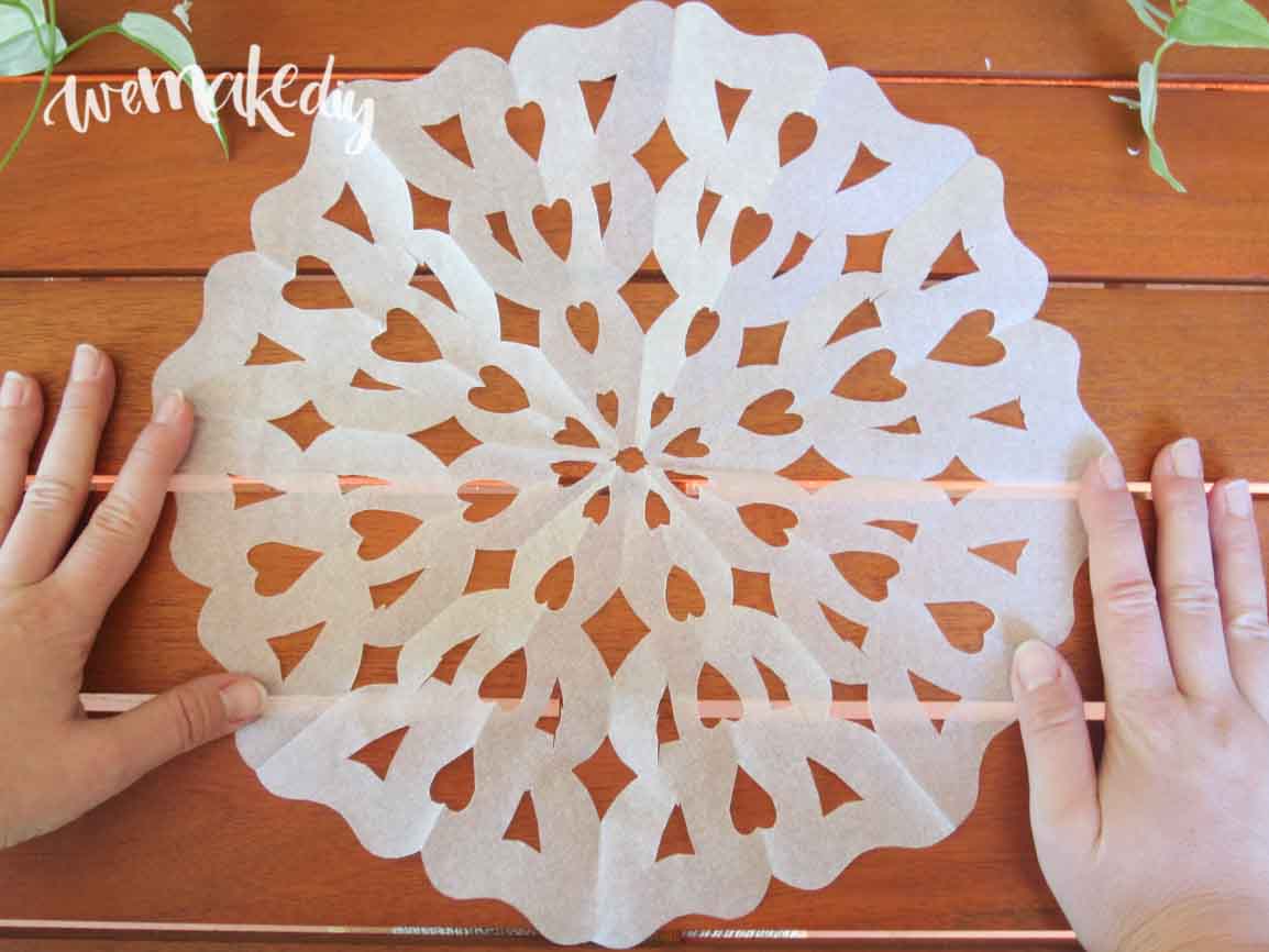 Una vez recortado el dibujo, desdobla todo el cucurucho y ¡tachán! Tendrás tu plantilla de mandala único y diseñado por ti. Plancha el papel para que la plantilla quede lo más lisa posible.