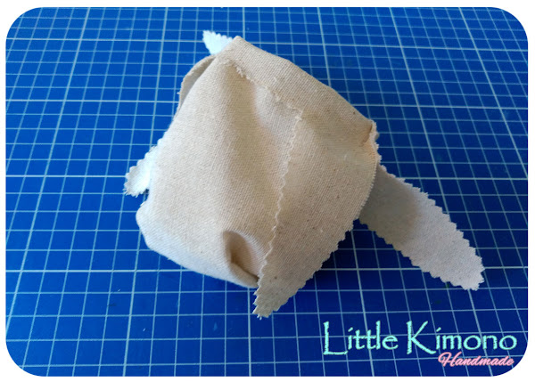 6. Y con la tela estampada cortamos dos piezas para colocar en las orejas, podemos usar pegamento textil.