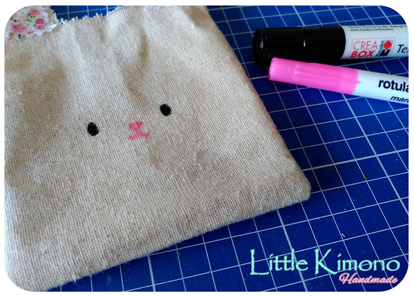7. Por la parte delantera dibujamos la cara con rotuladores para tela y en la parte trasera colocamos el pompón.