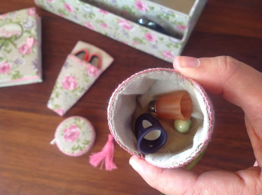 Y las fotos del organizador interior y de los accesorios: Libro de agujas, dedalera, funda para tijeras, funda de tijeras colgante, funda para la cinta métrica y alfiletero.